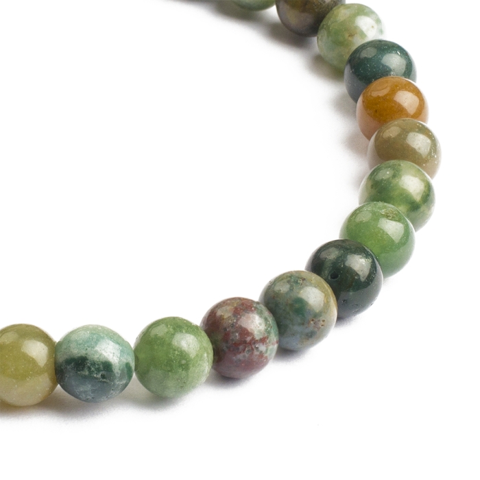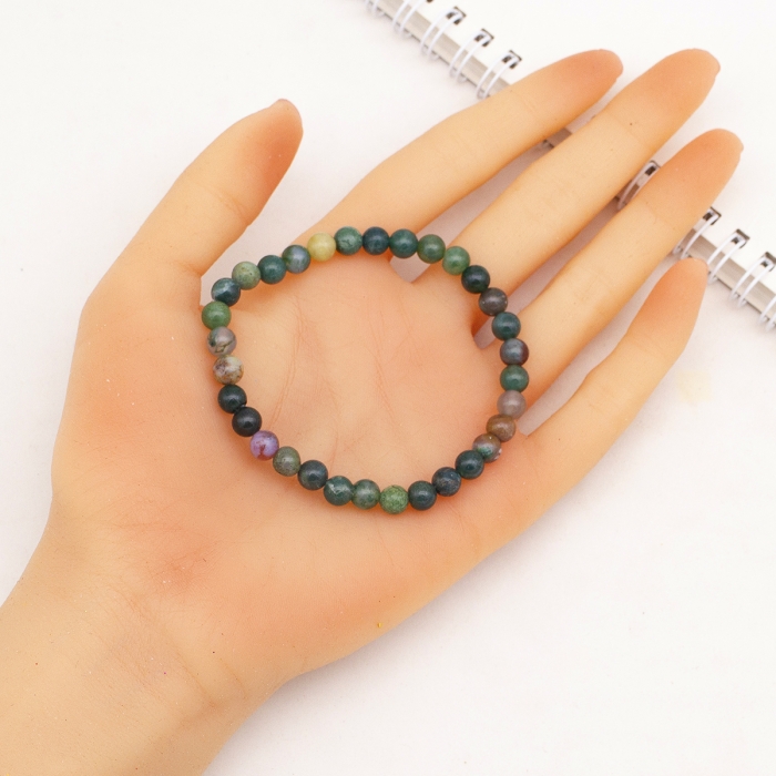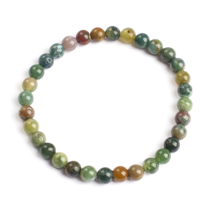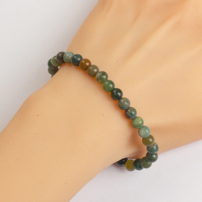 Браслет из бусин натурального индийского агата выполнен в классическом стиле с использованием круглых бусин. Каждая бусина обладает уникальным природным рисунком, создающим гармонию цвета и текстуры. Браслет собран на прочной эластичной нити, что делает его универсальным по размеру и удобным для повседневного ношения. Индийский агат известен своими мягкими природными оттенками, которые варьируются от зеленого и коричневого до красноватого и кремового.