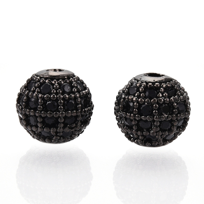 Бусины из Латуни с Фианитами, Круглые, Стойкое Покрытие, без свинца и кадмия, Цвет: Оружейная Сталь, Цвет фианитами: Черный.