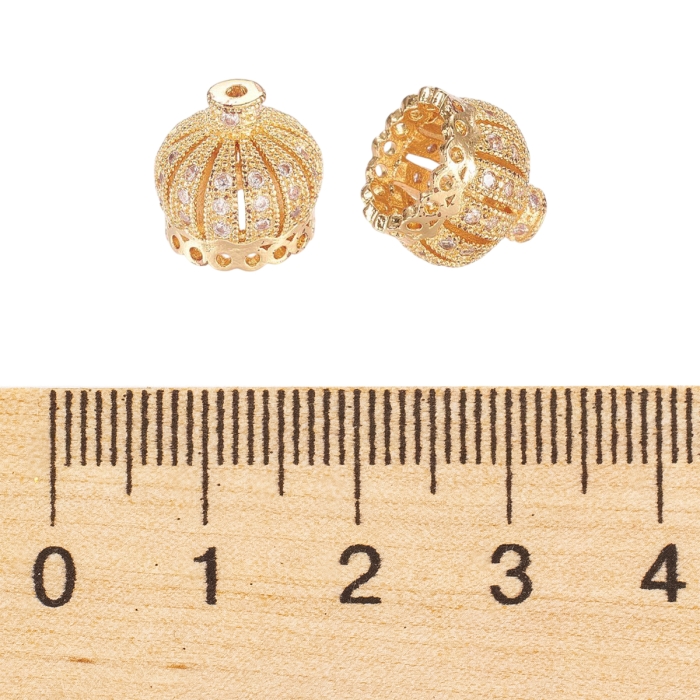 Изысканные латунные шапочки для бусин с микроинкрустацией прозрачных кубических циркониев выполнены в форме короны. Полая конструкция делает их легкими, а сияние фианитов придает изделиям роскошный и праздничный вид. Идеально подходят для создания подвесок с кистями и эксклюзивных украшений.