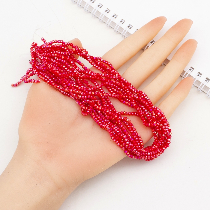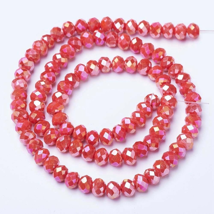 Граненые стеклянные бусины-рондели с электропокрытием сочетают матовый сплошной цвет с сиянием AB-эффекта (Aurora Borealis). Благодаря многогранной поверхности они отражают свет, создавая глубокий блеск и переливы, делающие украшения яркими и выразительными.