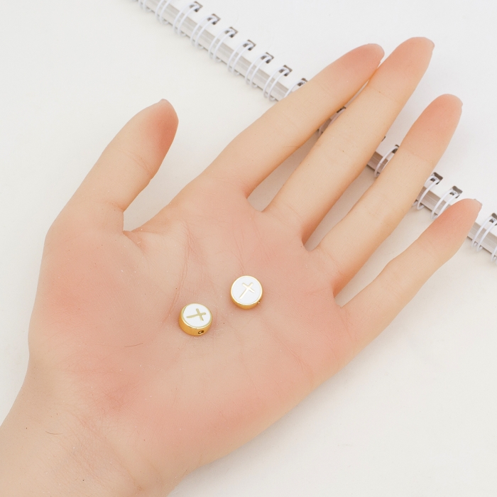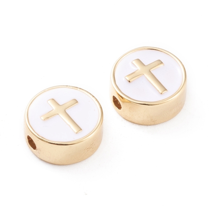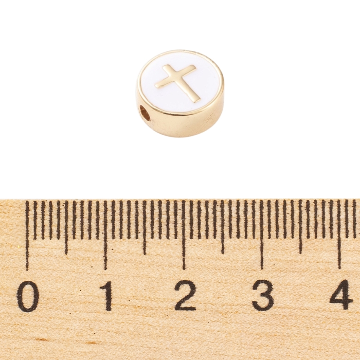 Изысканные бусины из латуни в форме плоского диска, декорированные эмалью и украшенные изящным крестом в центре. Поверхность покрыта настоящим золотом 18K, что обеспечивает долговременное сияние и защиту от потемнения. Декоративное покрытие не стирается при бережном использовании. Эмаль добавляет контраста и утонченного вида.