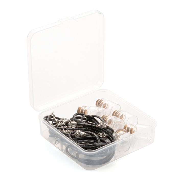 В наборе: Подвески Бутылочки, Стекло: 22х15мм, Горлышко 7мм, Емкость 5мл, 6шт, Шнур Вощеный Хлопковый с Застежкой Карабин Лобстер и Удленнительной цепочкой: Длина 45.5-46см, толщина 2мм, 6шт, Штифт Винтовой, Железо: 8х4х1мм, Отверстие 2мм, 6шт, Кольцо соединительное: 6х0.9мм, Внутренний диаметр 4.2мм, 1шт, Контейнер для Хранения, Пластик: 82х82х27мм, 1шт.