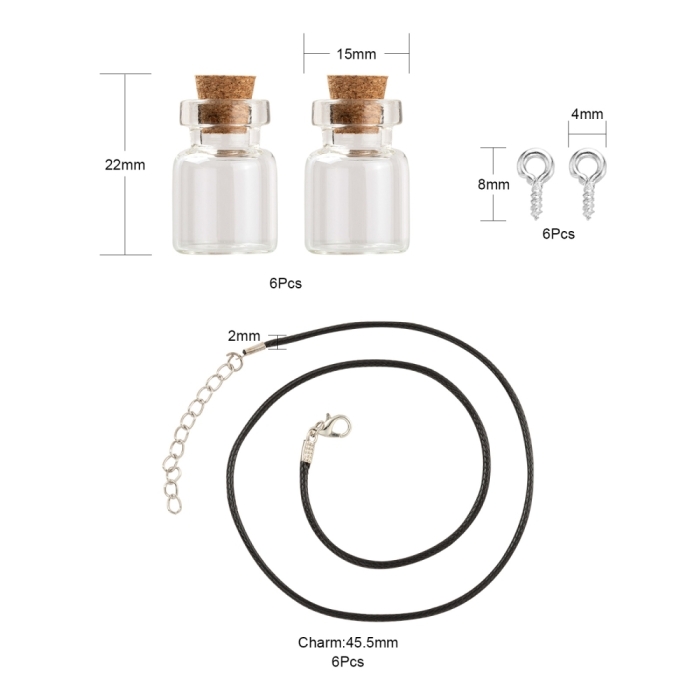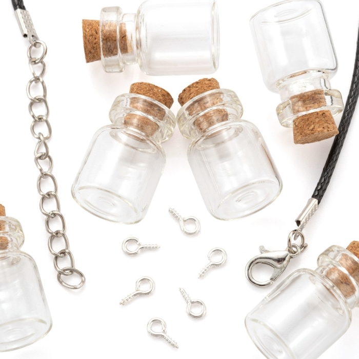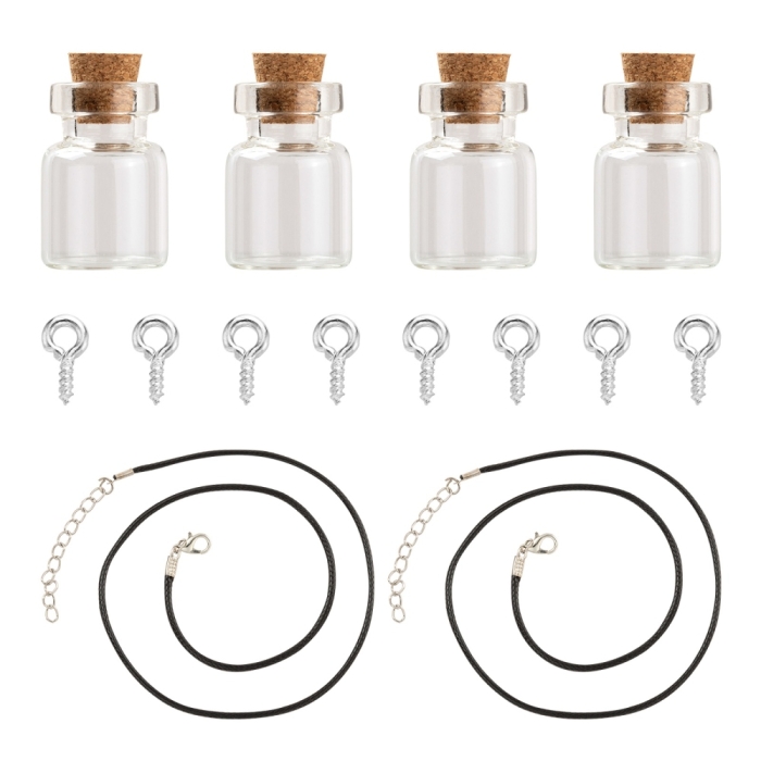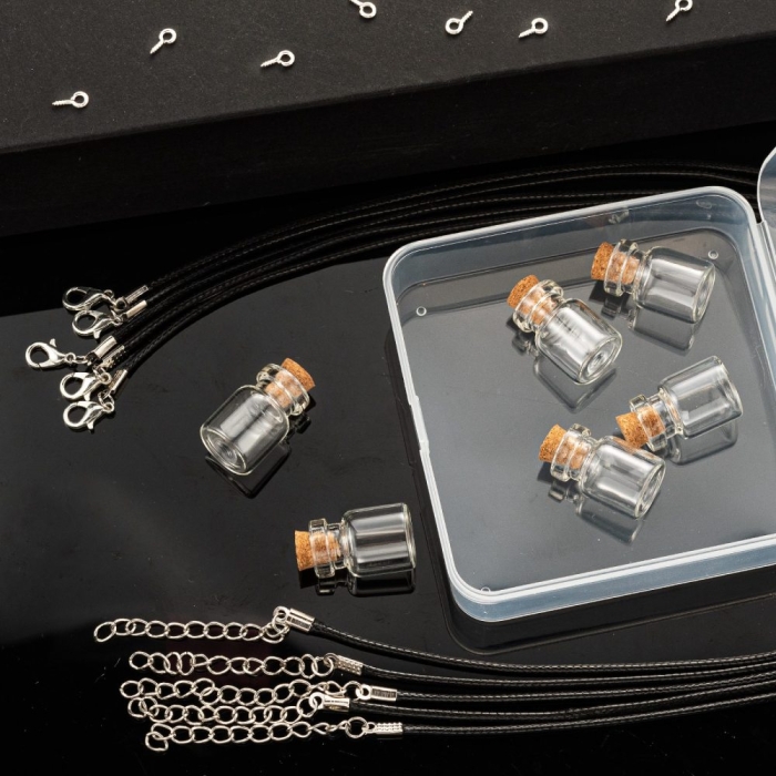 Набор для создания ожерелья включает кулоны-стеклянные бутылочки, штифты-винтовые подвесы из железа и вощеные шнуры для изготовления ожерелья.