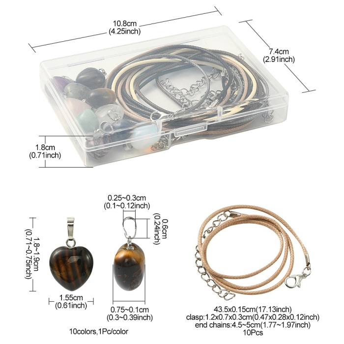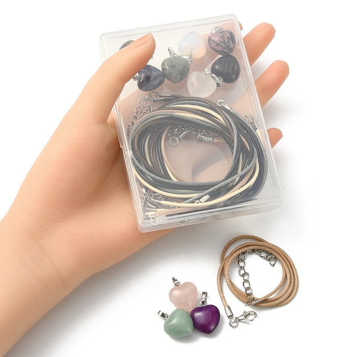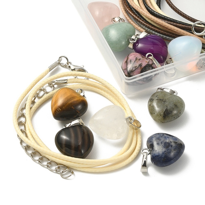 Набор Основы для Ожерелья, Шнур Вощеный Хлопковый с Застежкой и Цепочкой, Подвески Кулоны Сердце, Смешанные Натуральные и Синтетические Камни, Микс, Длина 45см, 108х74х18мм, 20шт/упак, (УТ100032315)