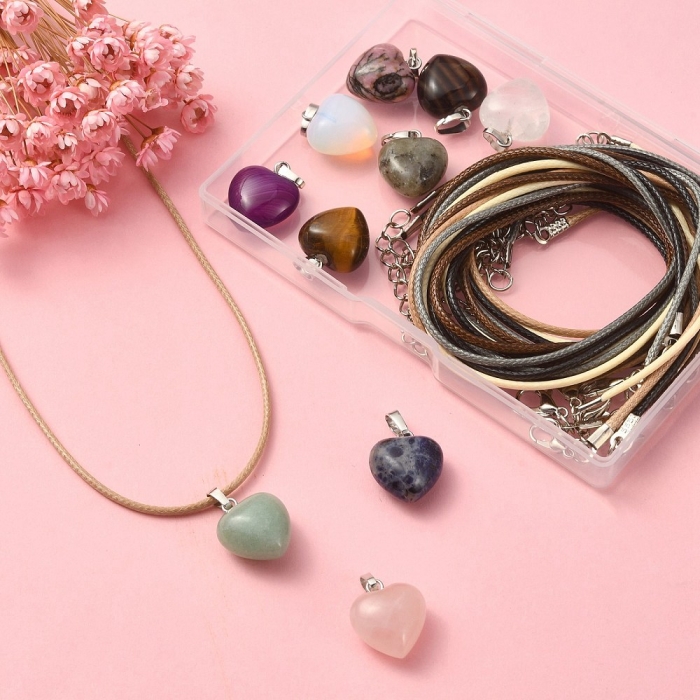 Этот комплект предназначен для самостоятельного создания стильных и символичных ожерелий. В набор входят вощёные хлопковые шнуры с застёжкой-карабином и удлиняющей цепочкой, а также подвески в форме сердца, выполненные из натуральных и синтетических камней.