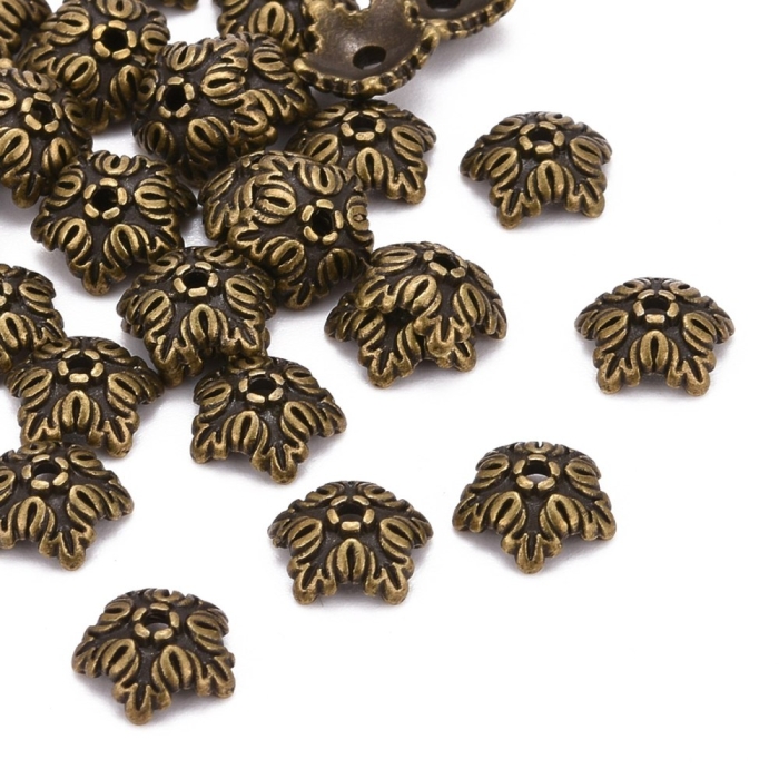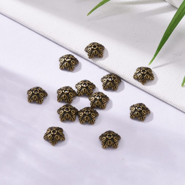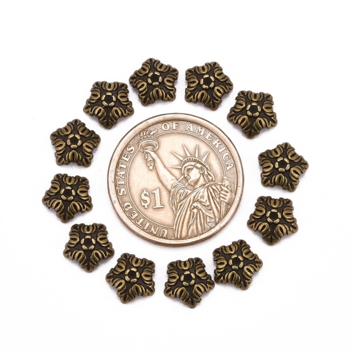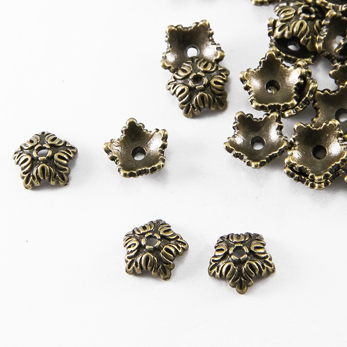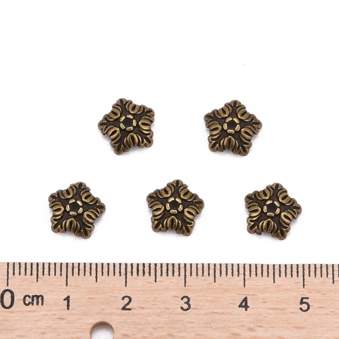 Шапочки для бусин в форме цветка с 5 лепестками выполнены в тибетском стиле. Они изготовлены из безопасного бижутерного сплава, не содержащего кадмия, никеля и свинца. Благодаря декоративному облику придают украшениям элегантность и завершенность.