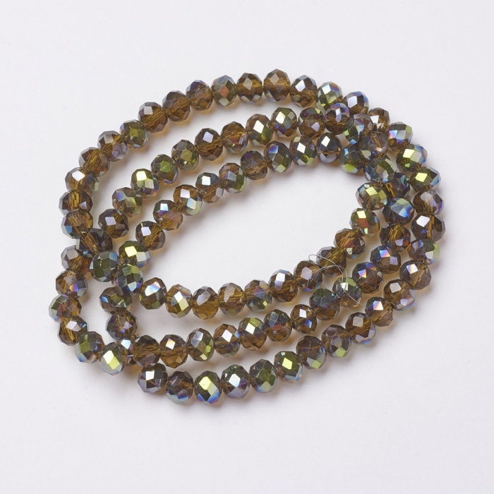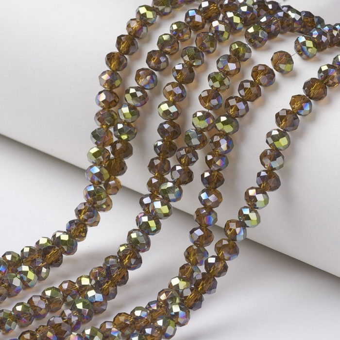 Бусины Гальваническое Стекло, Граненые, Полузеленое Покрытие, Рондель, Коричневый, 4х3мм, Отв. 0.4мм, около 120-123шт/40-43см/нить (УТ100025464)
