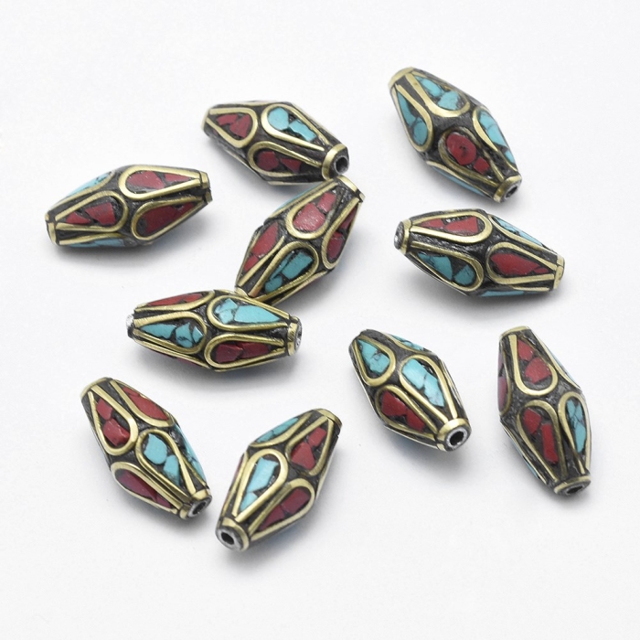 Бусины Ручной Работы из Латуни, Синтетический Коралл и Бирюза, Рис, Размер: 17~19x8~9мм, Отверстие 1.5мм, (УТ100027228)