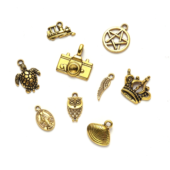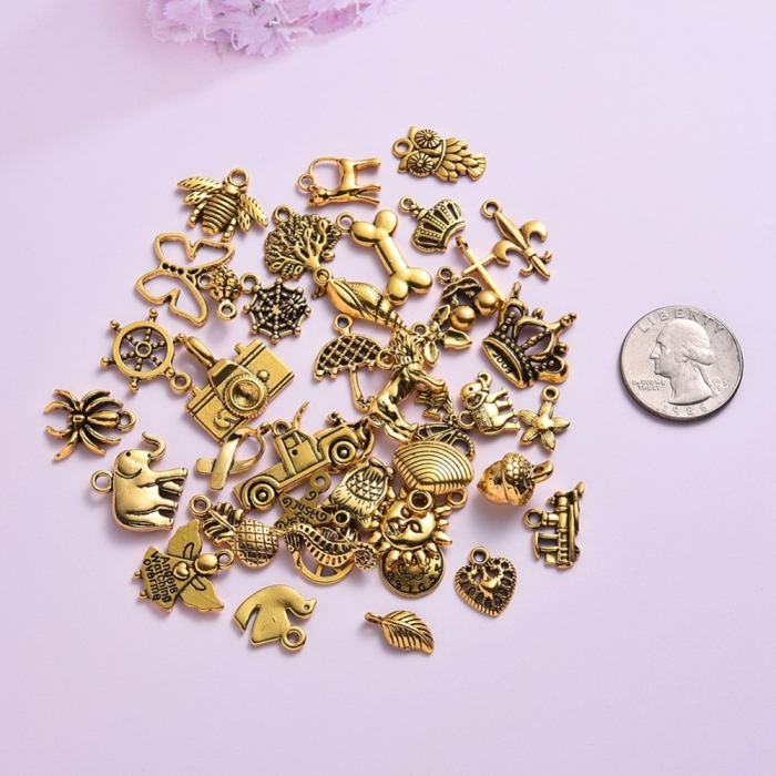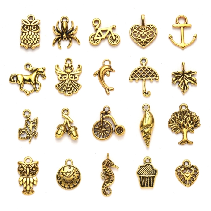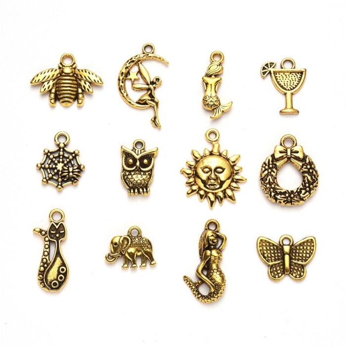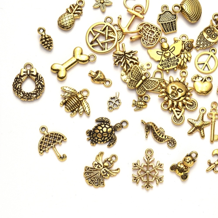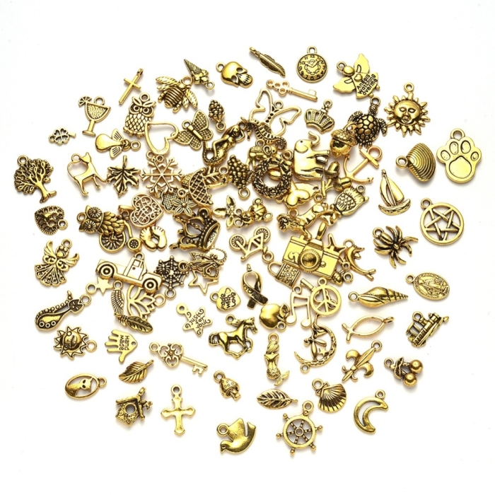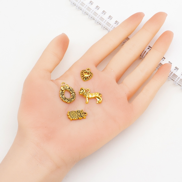 Набор подвесок и кулонов из цинкового сплава включает около 100 штук различных элементов в 90 уникальных формах. Это разнообразие позволяет использовать подвески для создания оригинальных и индивидуальных украшений в различных стилях — от винтажного до бохо.