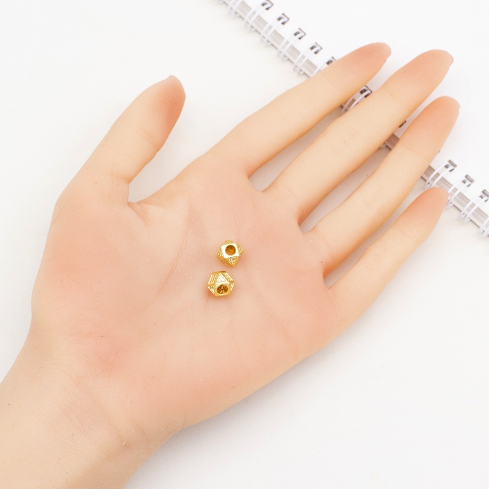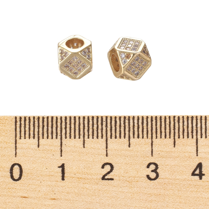 Вишукані полігональні намистини з латуні, інкрустовані прозорими кубічними цирконіями (фіанітами) за технологією мікропави. Покриття справжнім золотом 18K надає благородний блиск, стійкий до потьмарення. Ідеальний вибір для створення ювелірних прикрас преміум-класу.