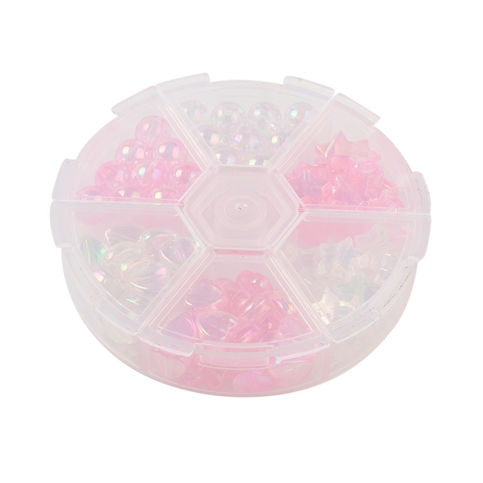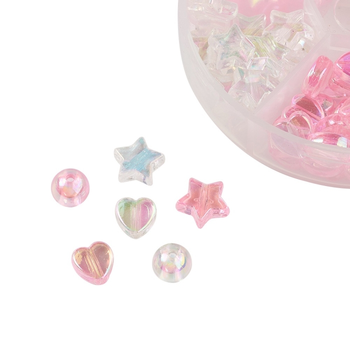 Круглі намистини: 8мм, отвір 1.5мм, близько 15шт/колір, 30шт, Намистини у формі серця: 8x8x3мм, отвір 1.5мм, близько 25шт/колір, 50шт, Намистини-зірки: 10x4мм, отвір 1.5мм, близько 15шт/колір, 30шт, Контейнери для намистин: 12.5x10.5x1.8см, 1шт.