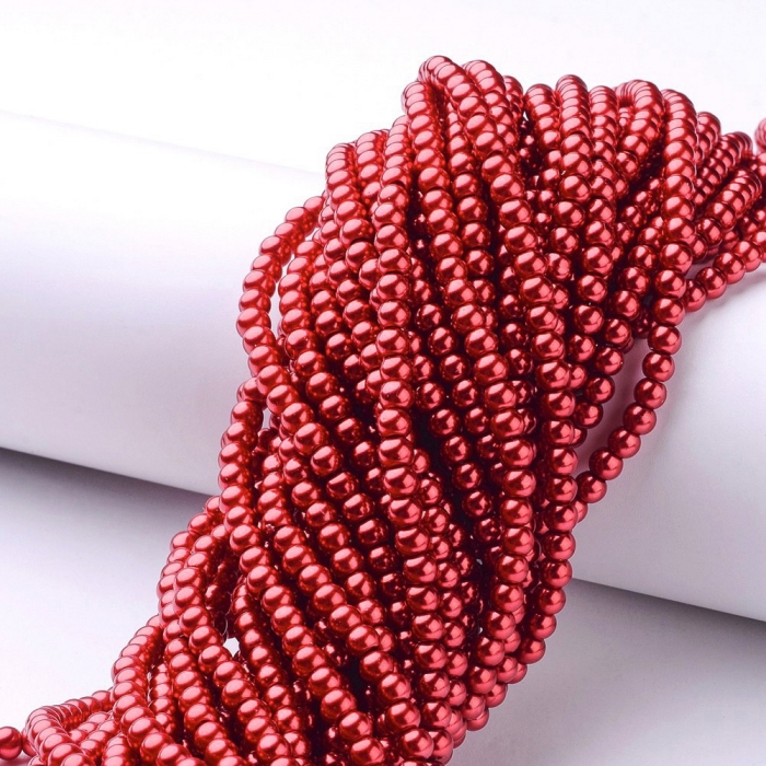 Перли Намистини Скло 4мм, Глянцеві, Круглі, Колір: Червоний, Діаметр: 4 мм, Отв-тя 1мм, близько 216шт / 86см / нитка, (УТ000005889)